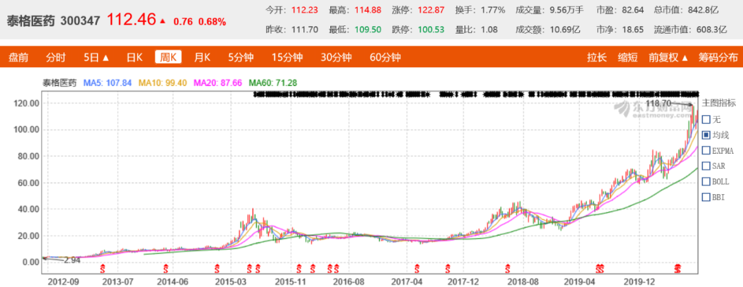 業績的高速增長,推動了泰格醫藥股價不斷水漲船高。8年時間,泰格醫藥股價由剛剛上市時的3.19元/股上漲到2020年8月6日收盤時的109.44元/股,股價上漲達到34倍。