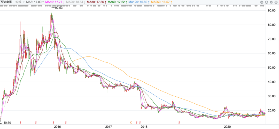 基于如此背景,萬達電影的股價也是一路下降。從2015年上市時,最高股價92.53元跌至如今的17.92元/股。
