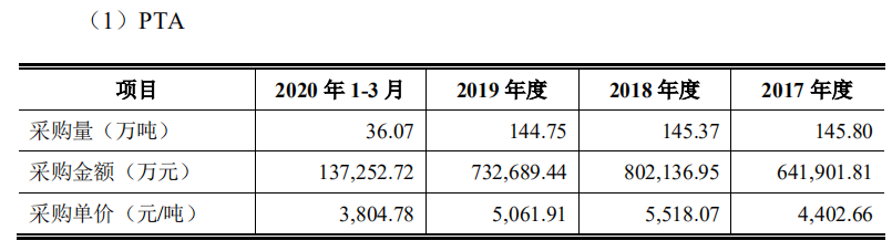 與此同時,原材料PTA價格受原油等基礎原料價格和市場供需關系影響,呈現不同程度的波動,公司原材料采購價格也存在一定的不確定性。報告期內,采購單價分別為4402.66元/噸、5518.07元/噸、5061.91元/噸、3804.78元/噸。
