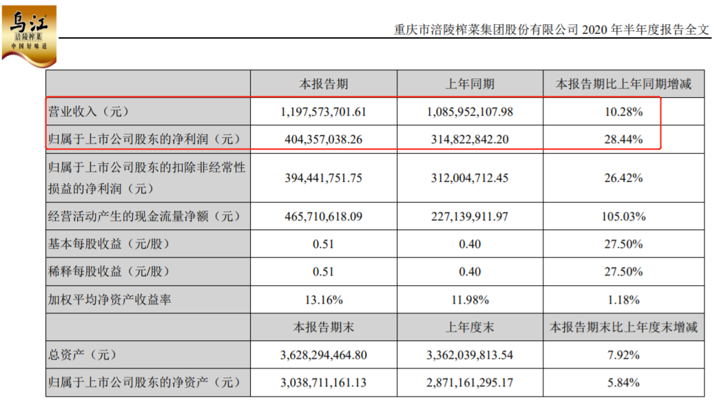 2020年8月20日晚,“國民品牌”涪陵榨菜(002507.SZ)再次交出一份亮眼的成績單,其公布的半年報(bào)顯示,報(bào)告期內(nèi)涪陵榨菜實(shí)現(xiàn)營收11.98億元,同比增長10.28%;凈利潤4.04億元,同比增長28.44%,營收利潤雙增長。