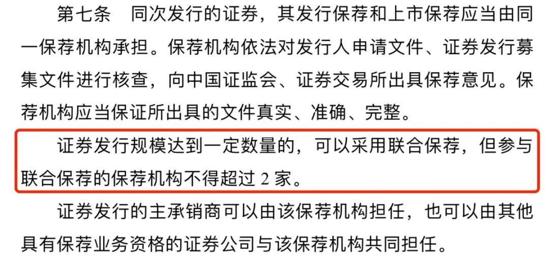 對此,資深投行人士王驥躍表示,“根據《證券發行上市保薦業務管理辦法》第七條,證券發行規模達到一定數量的,可以采用聯合保薦,但參與聯合保薦的保薦機構不得超過2家。最早4家輔導,是沒最后確定保薦機構,現在出局兩家剩兩家。進程不會有影響,科創板也不會有影響”。