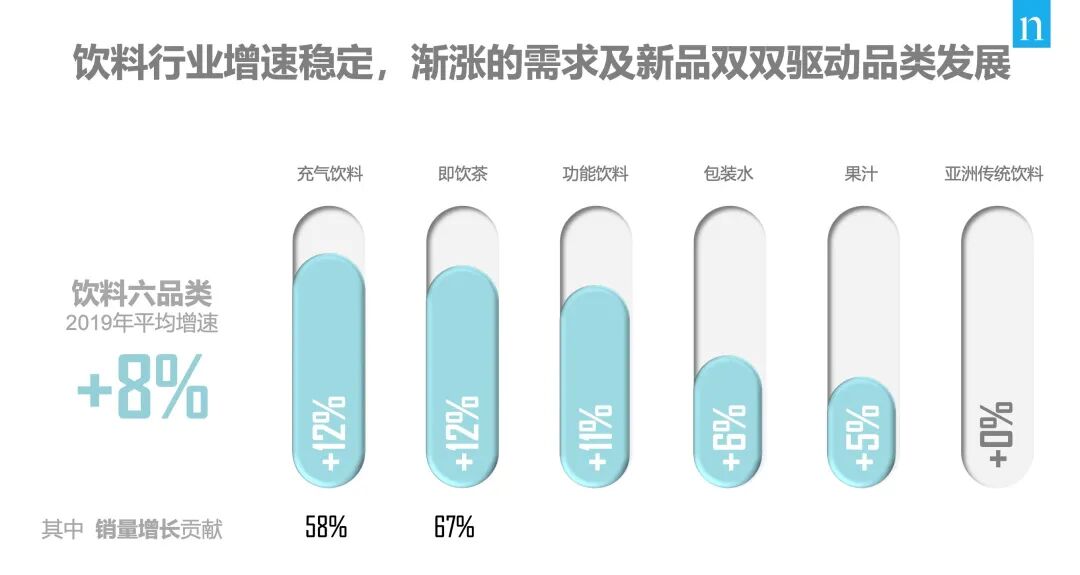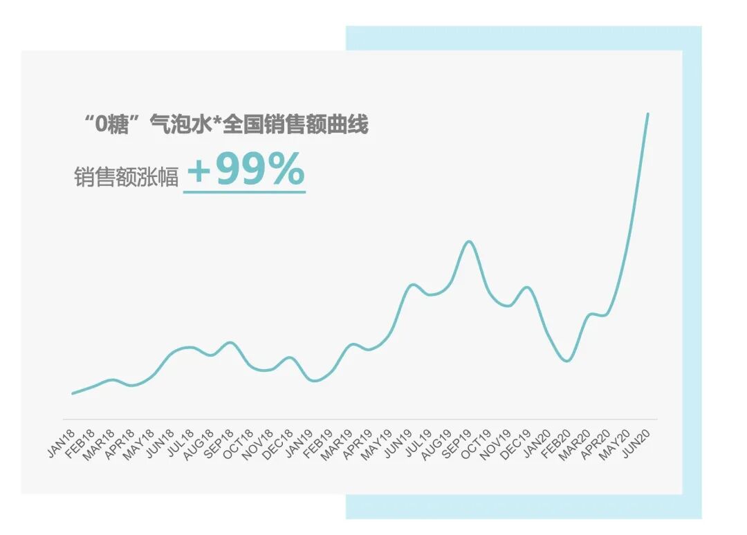 8月19日,尼爾森中國商務拓展部總監鄭冶分享了他們的一組調研數據:2019年,飲品六大品類中,充氣飲料與即飲茶的增長最為突出,均達到12%;而無糖的氣泡水(非可樂類充氣飲料)在最近一年畫出了驚人的增長曲線,2020年6月時銷售與上年同期相比幾乎翻番,主要品牌產品的SKU數量也從去年的77個猛增到134個。