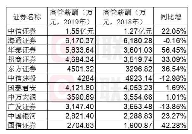 雖然中信證券2019年高管薪酬在12家券商中排第一,但中金公司董事、監事和高級管理人員的2019年年薪為2億元,遠超中信證券的1.55億元。此外,中金公司年薪超千萬元的高管有5名,數量也超過中信證券。