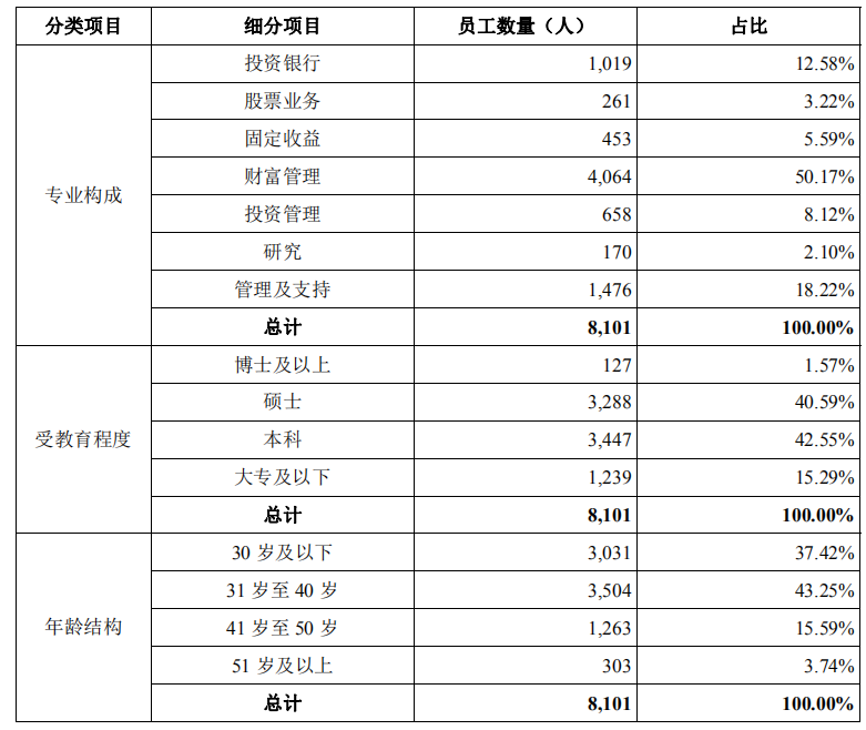 據招股書顯示,截至2019年底,中金公司共8101名員工,80.67%在40歲以下,40.59%為碩士學歷,本科學歷以上的比例高達84.71%。其中,財富管理項目員工最多,有4064人,占比過半;投資銀行業務有1019名員工,占比達到12.58%。