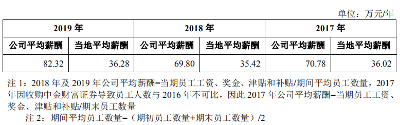 報告期內,公司管理人員平均年薪最高,分別為372.11萬元、345.58萬元和375.97萬元。職能部門中層平均年薪從2017年的72.48萬元增至2019年的76.08萬元,業務部門中層平均年薪從2017年的78.20萬元增至2019年的83.94萬元。