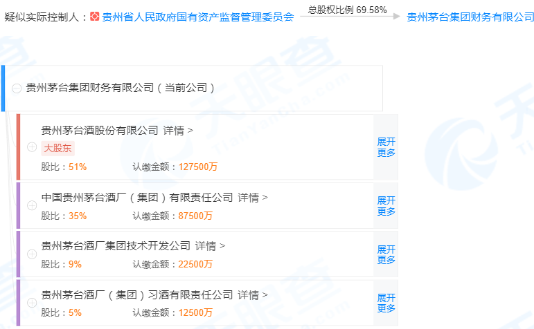 據(jù)天眼查信息,茅臺(tái)財(cái)務(wù)公司成立于2013年3月,注冊(cè)資本為25億元,所處行業(yè)為貨幣金融服務(wù)。股權(quán)結(jié)構(gòu)方面,茅臺(tái)持股51%,貴州集團(tuán)持股35%。