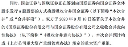 9月20日,國金證券(600109.SH)發布停牌公告稱,國聯證券(601456.SH)擬收購國金證券控股股東長沙涌金所持約7.82%的股權,同時國聯證券將通過換股的方式吸收合并國金證券。