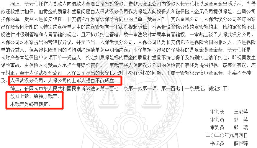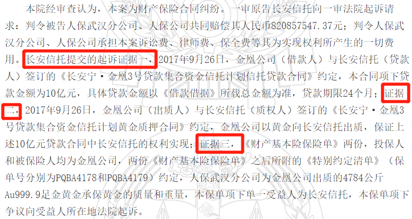 據(jù)悉,武漢金凰曾作為被保險人向人保財險武漢分公司投保,保單后附約定,后者為其出質(zhì)黃金承保質(zhì)量和重量,單一受益人為長安信托。保單項下爭議向受益人所在地法院起訴。