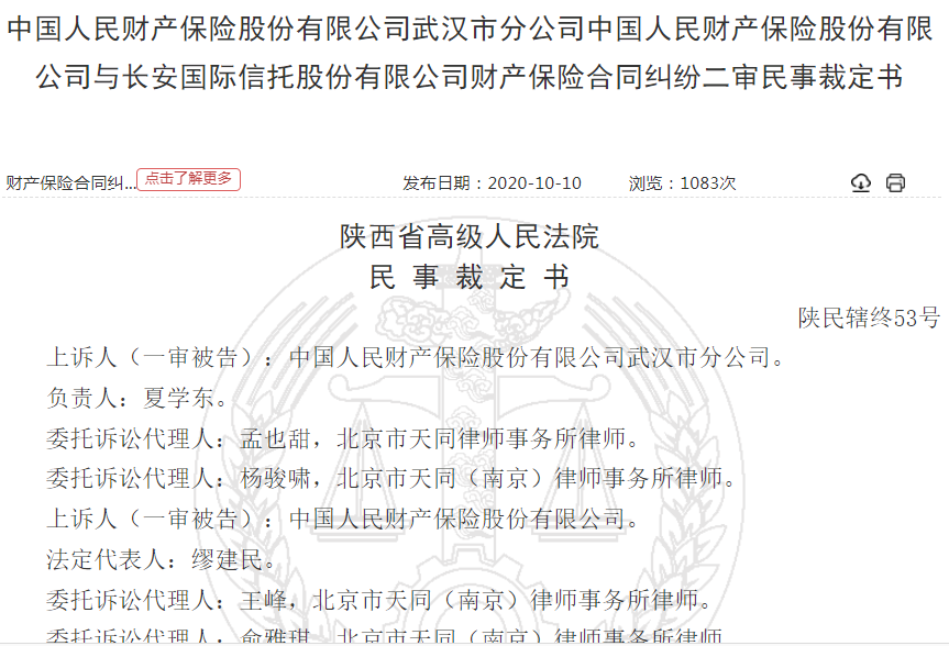 10月10日,陜西省高級人民法院發(fā)布一則《人保財險武漢分公司、人保財險與長安信托財產(chǎn)保險合同糾紛二審民事裁定書》,揭曉了對人保財險方面管轄權(quán)異議的裁定結(jié)果。