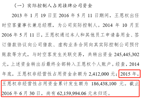 2017年6月,全國中小企業股份轉讓系統有限責任公司(以下簡稱“股轉系統”)下發的紀律處分公告顯示,時空客自2014年10月(即上市起)便出現實控人占用公司資產、虛構業務合同等問題,2015年,王恩權累計占用公司資金1.86億元(不含利息);還存在違規使用募集資金、違規信披的情況。