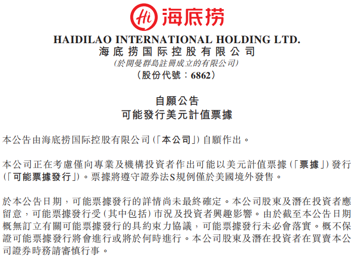 10月13日,海底撈公告稱,公司正在考慮向?qū)I(yè)及機(jī)構(gòu)投資者發(fā)行美元債。可能發(fā)行的票據(jù)將遵守證券法S規(guī)例僅于美國境外發(fā)售,發(fā)行詳情尚未最終確定。